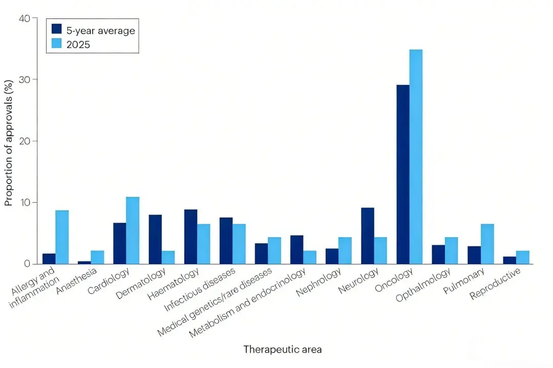 在治疗领域的分布上,肿瘤学仍是核心赛道,共有16款新药获批,占比35%,高于近五年29%的滚动平均值;心脏病学(5款,占11%)、过敏与炎症性疾病(4款,占9%)紧随其后,构成了非肿瘤领域的核心创新阵地。