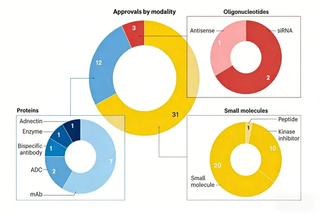 2025 年获批新药涵盖多种创新技术模态,包括首款基于 adnectin 的生物疗法 ——LIB Therapeutics 的 PCSK9 抑制剂 Lerodalcibep ,其结构比传统单抗更小、更稳定,且每月仅需皮下注射一次。