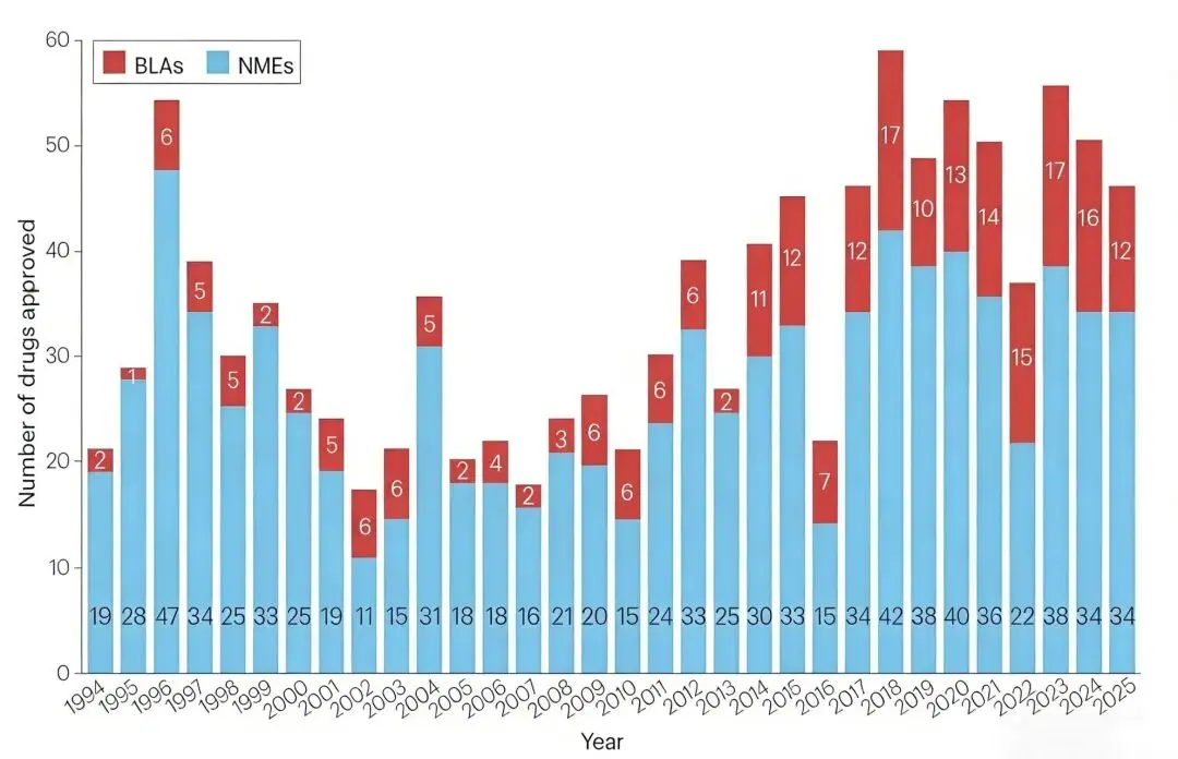 1994—2025年,FDA每年批准的新分子实体(NMEs)和生物制品许可申请(BLAs)数量