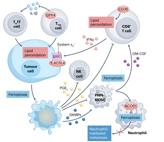 此外,铁死亡不仅导致细胞死亡,还会释放氧化脂质介质,这些分子可作为免疫信号招募中性粒细胞等免疫细胞。然而,这些信号可能既促进免疫激活,也可能诱导免疫抑制微环境,从而帮助肿瘤免疫逃逸。