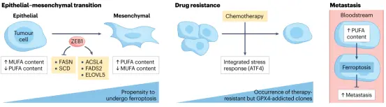 • 上皮-间充质转化(EMT)后的肿瘤细胞因脂质代谢改变,对铁死亡更易感,尤其是膜磷脂多不饱和脂肪酸(PUFA)增加。