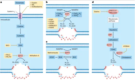 2. 增强铁依赖性脂质过氧化。能增加细胞内铁水平的化合物,如在促铁死亡环境中的铁螯合剂或能从储存蛋白中释放铁的化合物,都能促进铁死亡(例如,系统xc⁻的抑制剂erastin)。