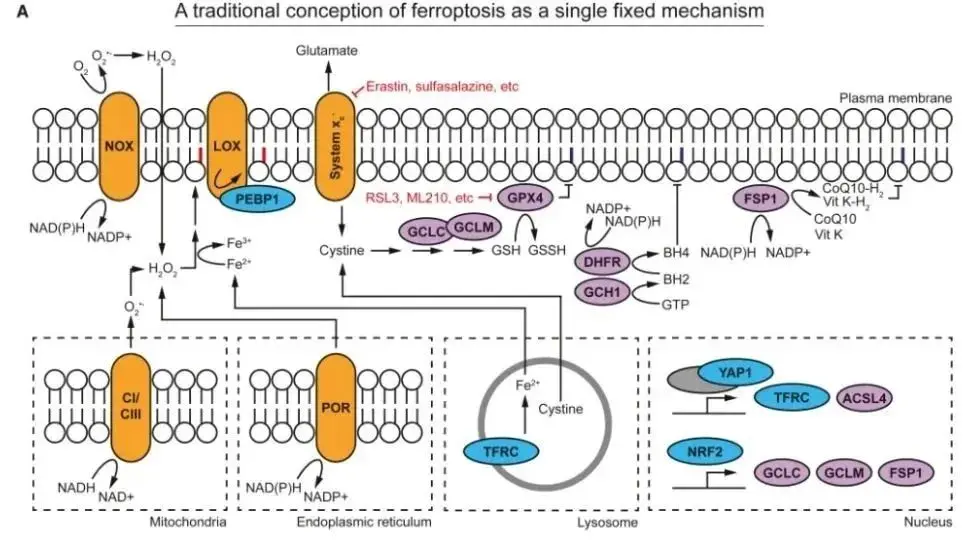 铁依赖性脂氧合酶(LOXs)最初被认为主导此过程,但最近的研究表明,其它氧化还原酶(如NADPH-细胞色素P450还原酶)也可通过生成ROS,进而通过芬顿反应产生·OH自由基发挥作用。