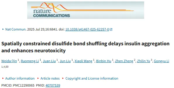 [4] Qin W, Li R, Liu J, Liu J, Wang X, Hu B, Zheng Z, Yu Z, Li G. Spatially constrained disulfide bond shuffling delays Insulin aggregation and enhances neurotoxicity. Nat Commun. 2025 Jul 25;16(1):6841. doi: 10.1038/s41467-025-62257-0