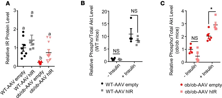 注射AAV-hIR增加了OB/OB小鼠肝脏中的IR蛋白和Insulin刺激的Akt磷酸化[3]