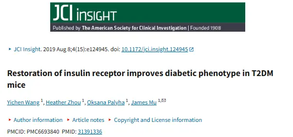 [3] Wang Y, Zhou H, Palyha O, Mu J. Restoration of Insulin receptor improves diabetic phenotype in T2DM mice. JCI Insight. 2019 Aug 8;4(15):e124945. doi: 10.1172/jci.insight.124945. PMID: 31391336; PMCID: PMC6693840.