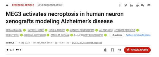 [1] Sriram Balusu et al. ,MEG3 activates necroptosis in human neuron xenografts modeling Alzheimers disease.Science381,1176-1182(2023).DOI:10.1126/science.abp9556