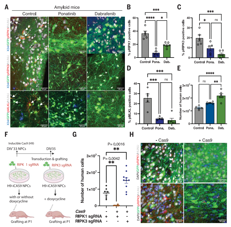 进一步,研究人员还对接受异种移植的小鼠进行了 ponatinib  dabrafenib 坏死程序激酶抑制剂治疗。它们发现,与未经处理的小鼠相比,治疗组中的 pRIPK1pRIPK3 pMLKL 水平显著下降。神经细胞数量的 qPCR 分析显示,与对照组相比,治疗组中的 神经元数量显著增加。此外,进一步的研究还揭示了 RIPK3 基因的敲除对神经元的存活具有改善作用,并且在 缺乏 RIPK3 的人类神经元中,坏死信号显著减少。