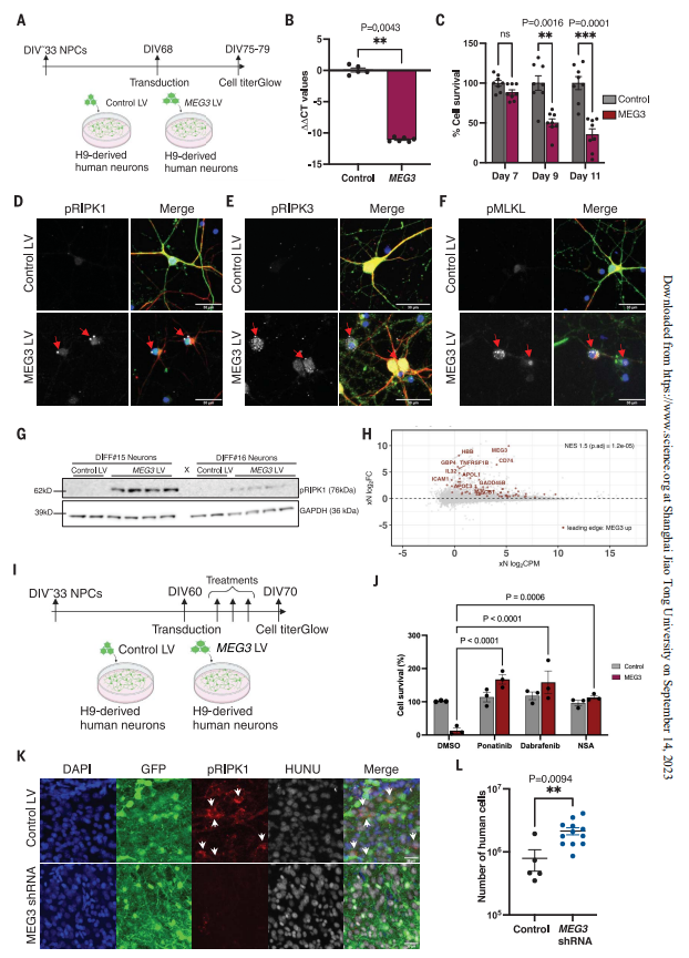 体外实验也显示,MEG3 表达可以通过激活细胞程序性坏死途径标志物(包括pRIPK1pRIPK3 pMLKL诱导人类神经元细胞死亡。