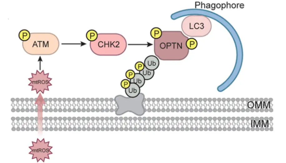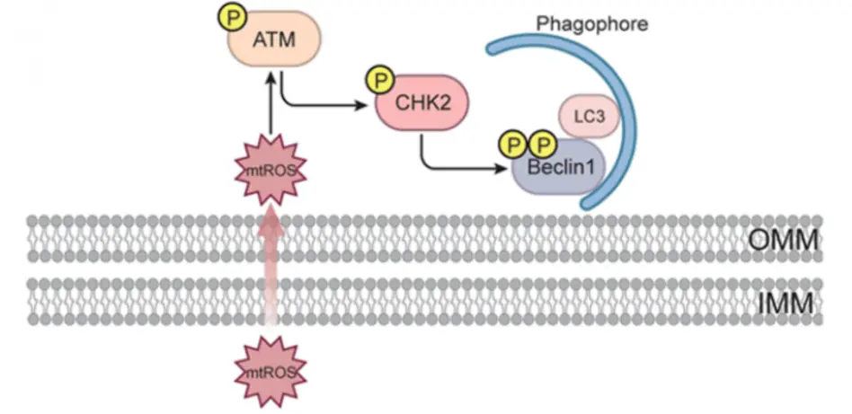 研究表明,mtROS 通过激活 DNA 损伤应答通路 ATM-CHK2,促使 CHK2 磷酸化 ATAD3A(Ser371),阻断 PINK1 向内膜转运,导致 PINK1 在外膜积累,从而启动 PINK1/Parkin 依赖的自噬。同时,CHK2 还通过磷酸化自噬受体 OPTN(Ser177/Ser473)增强受损线粒体向自噬体的靶向,并通过 Beclin 1 调控自噬体膜的形成。