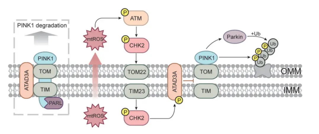 在最新研究中,研究者揭示了 mtROS 可作为信号分子直接激活 ATM-CHK2 通路。被激活的 CHK2(checkpoint kinase 2)与线粒体膜蛋白 ATAD3A 相互作用,并在 Ser371 位点磷酸化该蛋白。此磷酸化事件破坏了 PINK1 与线粒体转运复合体 TOM22/TIM23 的结合,从而阻断 PINK1 向内膜的转运,使 PINK1 在外膜积累并触发 PINK1/Parkin 依赖的线粒体自噬。