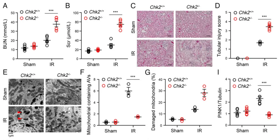 体内模型验证显示,CHK2介导的线粒体自噬可减轻缺血再灌注引起的肾损伤,提示该通路在应激条件下有助于维持细胞稳态和存活。