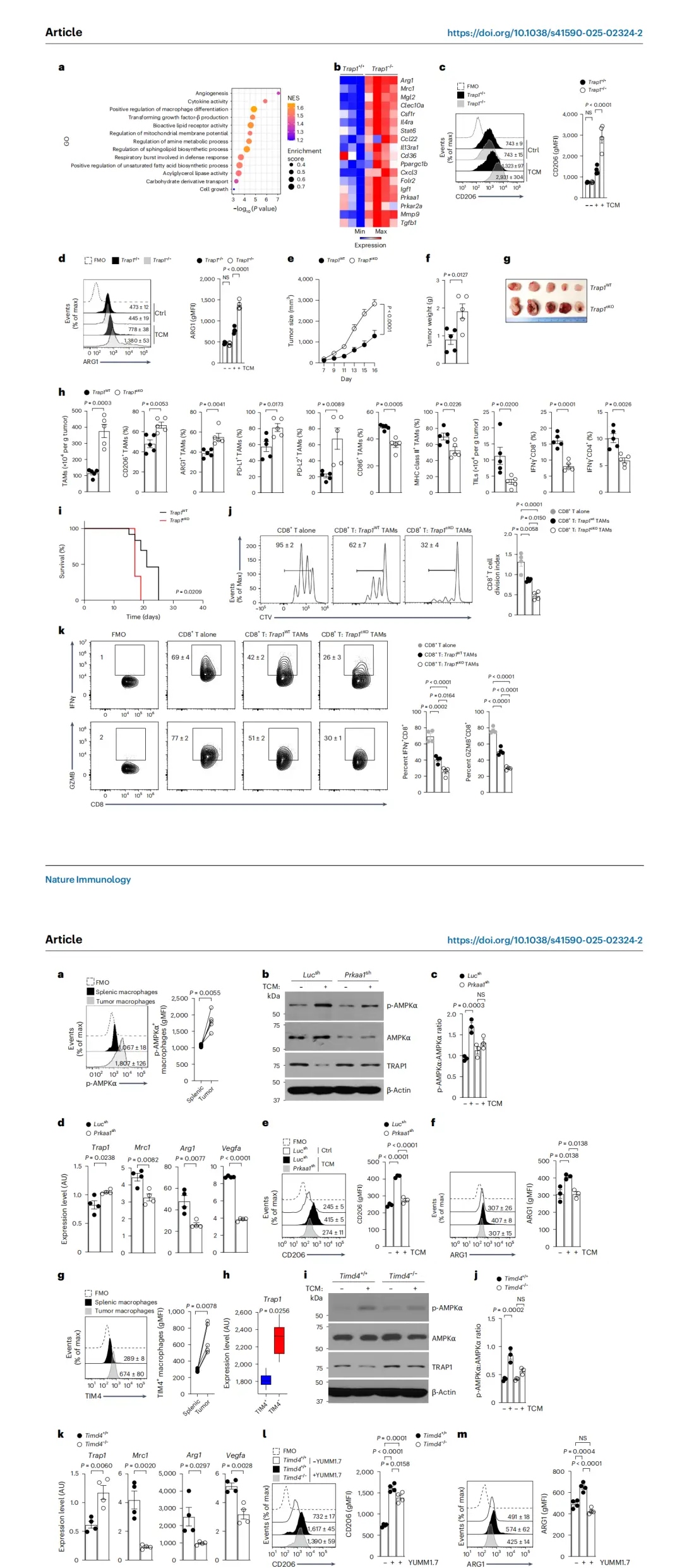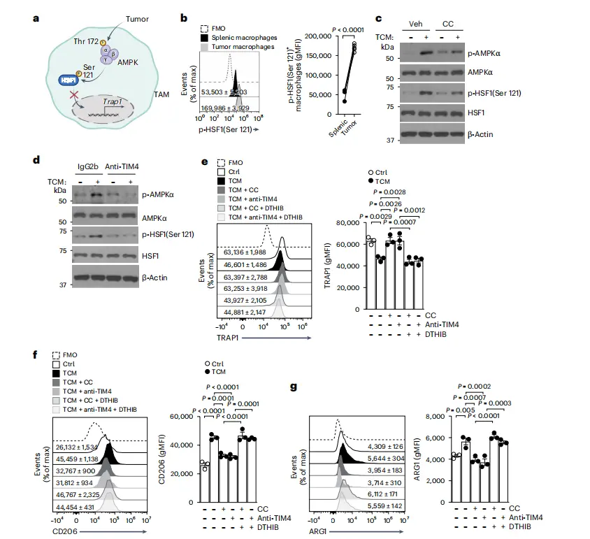简单来说,肿瘤通过TIM4–AMPKα信号通路的激活来“关闭”TRAP1的表达,再利用α-KG-JMJD3通路重塑巨噬细胞的表观遗传状态,使其转化为免疫抑制型。TIM4的基因敲除或TIM4受体的阻断则能够显著减少AMPK的激活,从而恢复TRAP1的表达,抑制免疫抑制表型的形成。