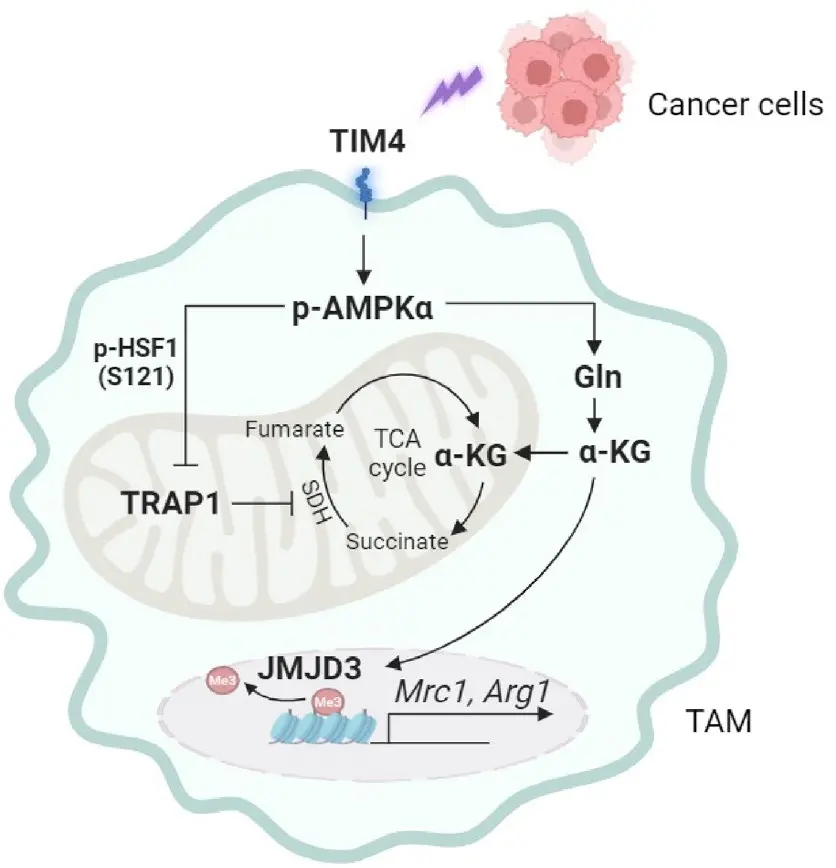 在肿瘤微环境(TME)中,巨噬细胞表面的TIM4受体通过与磷脂酰丝氨酸(PS)的结合,激活AMPK信号通路。一旦AMPK被激活,它会磷酸化并抑制热休克因子1(HSF1)的活性。HSF1本身是TRAP1转录的关键调控因子,激活HSF1能够促进TRAP1的表达。因此,当AMPK激活后,抑制了HSF1的功能,进而导致TRAP1的表达下降。当TRAP1水平下降时,巨噬细胞的线粒体呼吸增强,能量代谢更加旺盛,并积累代谢物α-酮戊二酸(α-ketoglutarate,α-KG)。α-KG可激活去甲基化酶JMJD3,促进组蛋白去甲基化,从而启动一系列免疫抑制相关基因的表达。