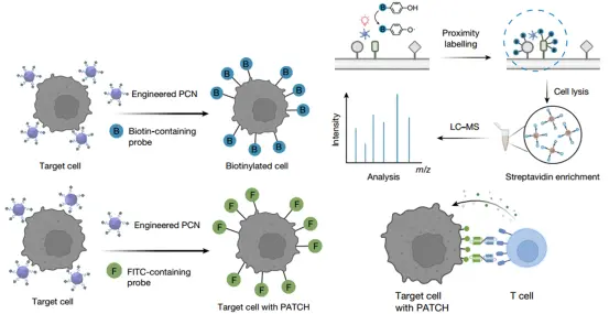 PCN 纳米酶首先会被靶向递送至肿瘤细胞表面,随后通过外部的红光或超声进行精准、无创的激活。被激活的纳米酶会催化含有人工抗原(FITC)的探针分子,使其与纳米酶周围(纳米级别内)的细胞表面蛋白发生快速、大量的共价连接,在靶细胞表面构建高密度抗原簇,并结合 FITC 结合双特异性T细胞衔接器(BiTE),诱导 T 细胞受体聚集和活化,增强其对肿瘤细胞的识别和杀伤。