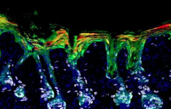 ▲毛囊干细胞(绿色)迁移和扩增(白色),通过分化为表皮谱系(红色),帮助修复皮肤屏障