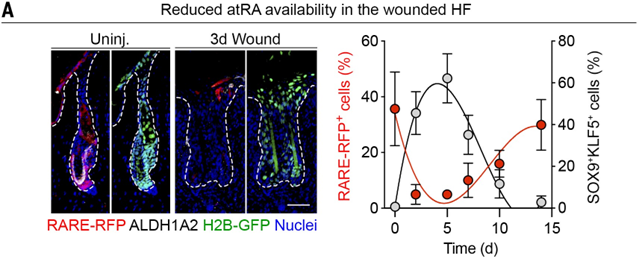 通过检测 atRA 合成的速率限制酶 ALDH1 的表达模式和活性,以及对 HFSC 进行转导实验和小鼠模型研究,发现 atRA 通过调节染色质水平来调控 HFSC 的谱系可塑性,维持其干细胞特性。