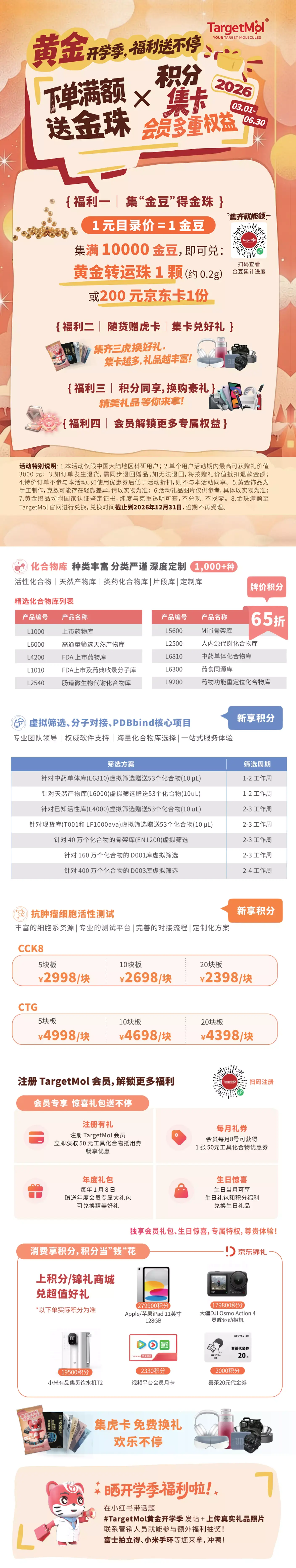 | 针对中药单体库(L6810)虚拟筛选赠送53个化合物(10 μL) | 1-2 工作周 |