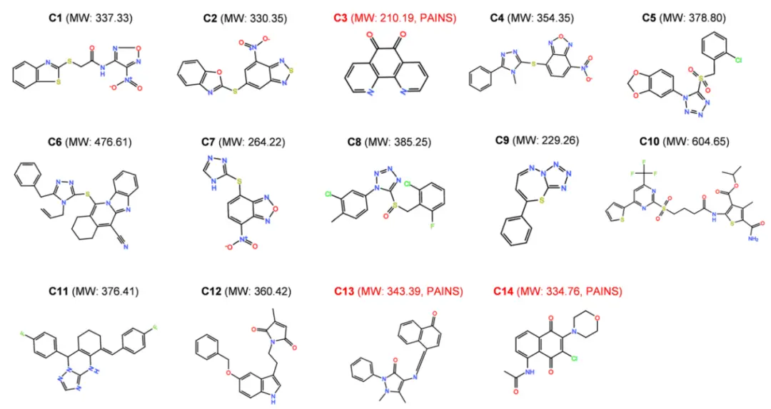 利用这一新构建的平台,研究团队接下来从 Chemdiv 化合物库 中进行了大规模筛选(包含108,800个化合物),经过多轮验证,最终确定了 14种能够显著降低内源性 Myc 蛋白水平的新型小分子化合物,并将这14种化合物被命名为 C1–C14。