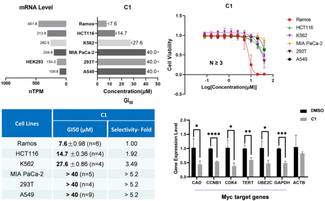 在功能验证中,C1 对高 Myc 表达的癌细胞(如 Ramos、HCT116、K562)具有明显的 选择性杀伤效应,GI₅₀ 值与 Myc 表达水平呈负相关;同时,C1 能 选择性下调 Myc 靶基因(如 CAD、CCNB1、CDK4、TERT、UBE2C)的表达,而对非靶基因(如ACTB、HPRT1)无影响。