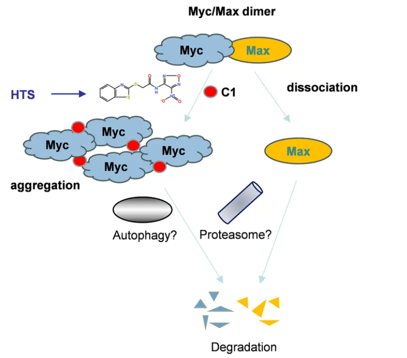 C1 是其中最突出的化合物,它不仅能结合并降解 Myc 蛋白,还能破坏 Myc/Max 相互作用并诱导 Myc 聚集,加速其清除,从而成为一种特异性的 Myc 降解剂。C1 的机制可能属于非典型的分子胶,类似于通过促进靶蛋白聚集来诱导降解的 BI-3802;其作用可能涉及蛋白酶体和自噬途径,但具体参与的 E3 泛素连接酶及分子机制仍需进一步研究。