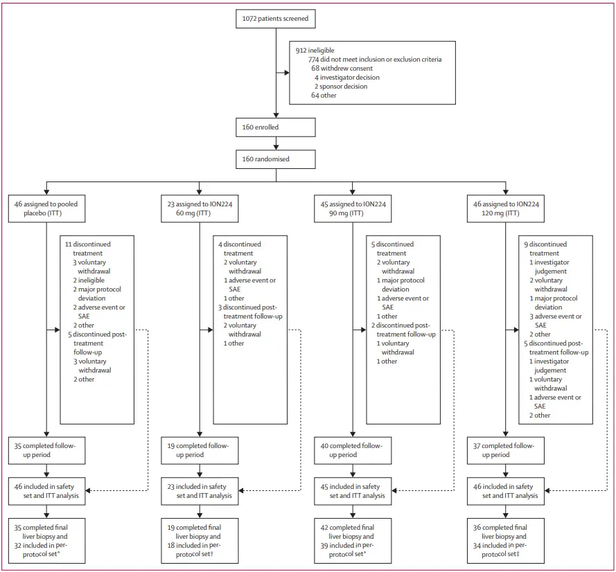 ION224-CS2 是一项 自适应、分为两部分的、多中心、随机、双盲、安慰剂对照的 II 期临床试验,纳入 18–75 岁、活检确诊为 MASH 且伴有纤维化(F1、F2 或 F3 期),并且基线肝脏脂肪变性 ≥10% 的患者。共筛查了1072名患者,其中 160 名 符合要求,并被随机分配至 ION224(三个剂量组:60 mg、90 mg、120 mg)或安慰剂组,进行为期一年的治疗研究。