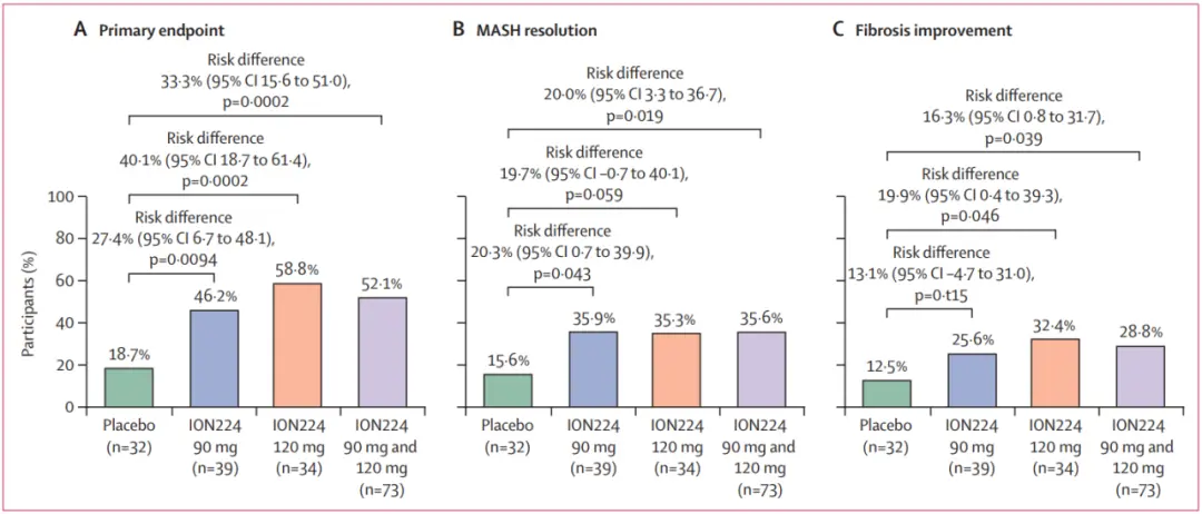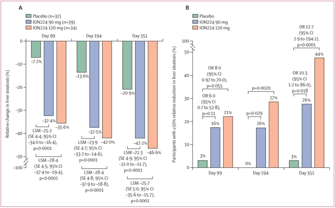 - 肝脏硬度(瞬时弹性成像)显著下降,ION224 组 52% 受试者下降 ≥25%(vs 安慰剂 28%)。