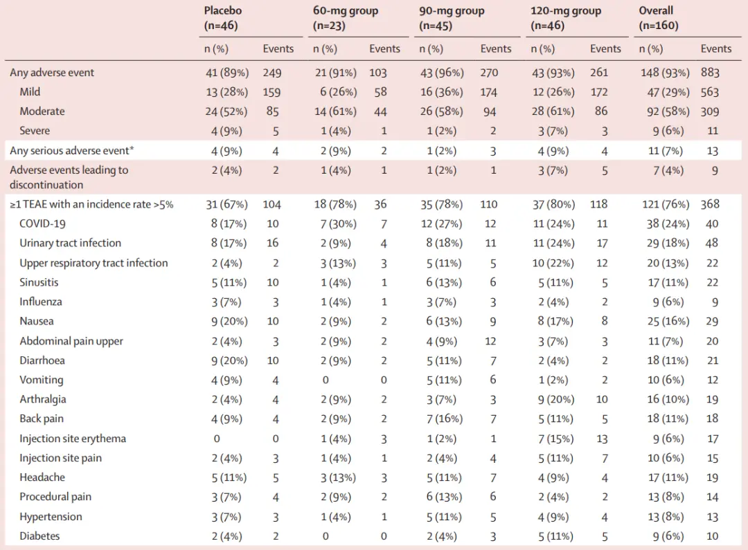 - 最常见与药物相关事件:注射部位反应(红斑、疼痛)、恶心。