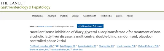 近期,The Lancet (IF 88.5)刊登的一篇文章公布了一项关于 MASH 的 II 期临床试验结果。研究发现,一种二脂酰甘油酰基转移酶2 (DGAT2)反义寡核苷酸抑制剂 ION224 可抑制 新生脂质合成(de novo lipogenesis)——这一代谢通路与脂毒性及其相关炎症、肝细胞损伤和纤维化密切相关。DGAT2 在肝脏脂肪生成与储存中发挥核心作用,通过阻断 DGAT2,能够从疾病根源干预,直接切断病程进展。