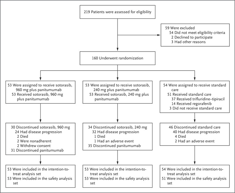 本试验随机、非盲、多中心,共筛查了 219 位未接受过 KRAS G12C 抑制剂治疗的 KRAS G12C 突变化疗难治性转移性结肠癌患者,最终筛选到 160 位符合条件的患者,按照 1:1:1 的比例随机分成三组:每日摄入 960 mg / 240 mg Sotorasib 联合 Panitumumab 或是常规疗法(曲氟尿苷-替匹拉西或瑞格非尼)。