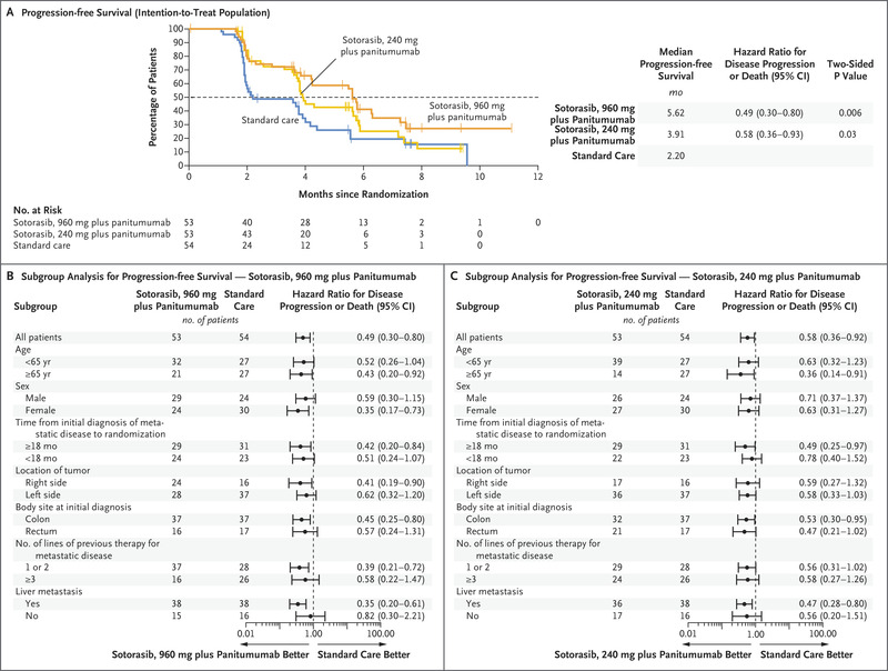 通过盲法独立中央审查评估,960 mg 和 240 mg Sotorasib - Panitumumab 联合治疗的中位无进展生存期分别为 5.6 个月( 95% 置信区间 [CI],4.2 ~6.3 )和 3.9 个月 ( 95% CI,3.7~ 5.8 ) 。 而常规疗法的中位无进展生存期为 2.2 个月 ( 95% CI,4.2 ~ 6.3 ) 。