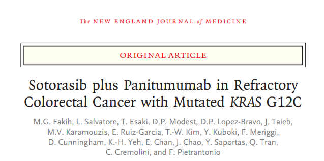 [1] Fakih MG, Salvatore L, Esaki T, et al. Sotorasib plus Panitumumab in Refractory Colorectal Cancer with Mutated KRAS G12C [published online ahead of print, 2023 Oct 22]. N Engl J Med. 2023;10.1056/NEJMoa2308795. doi:10.1056/NEJMoa2308795