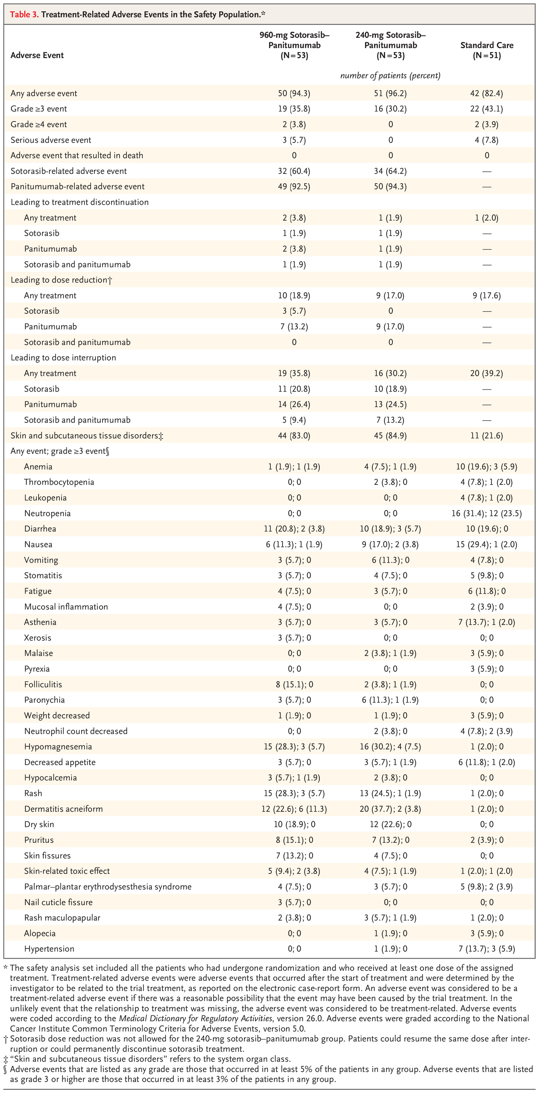 在不良反应方面,Sotorasib - Panitumumab 联合治疗的常见不良反应包括 低镁血症(分别占 960 mg Sotorasib 组的 28.3% 和 240 mg Sotorasib 组的 30.2% )、皮疹(分别占 28.3% 和 24.5% )、痤疮样皮炎(分别占 22.6% 和 37.7% )。在常规疗法中,常见的不良反应有 中性粒细胞减少( 31.4% )和 恶心( 29.4% )。三组患者中 3 级或以上的治疗相关不良反应发生率分别为 35.8%、30.2% 和 43.1%,严重不良反应占到 5.7% 、 0% 和 7.8% ,并导致 3.8% 、 1.9% 和 2.0% 的患者终止了治疗。
